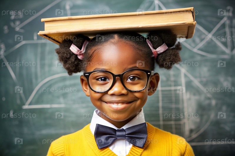 Красивая афроамериканская девушка с очками и книгами. Ребенок впервые ходит в школу. Ребёнок в классе с доской