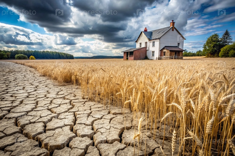 Концепция глобального потепления на планете Земля. Сухая и треснувшая земля и поле пшеницы. Пшеница фермера мертва, мертва, высохла. Последствия изменения климата