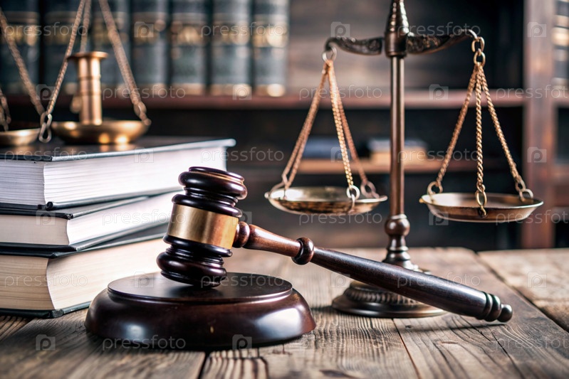 Древесный молоток, книги и весы на столе