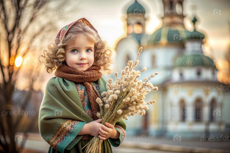 Портрет трехлетней девочки в русском народном шале с букетом дикой травы в руках на фоне православной церкви