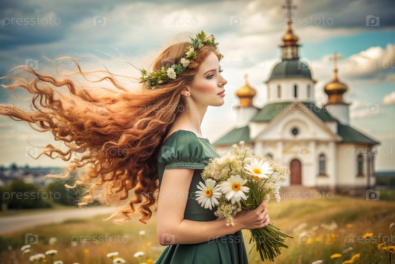 Всероссийский День семьи, любви и верности Красивая маленькая кудрявая девочка с букетом ромашек на фоне Православной церкви День святого Валентина Петра и Февронии
