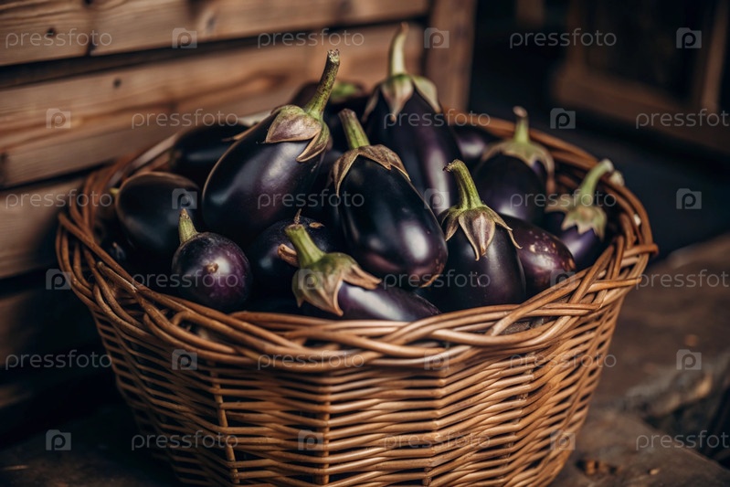 Концепция выращивания продуктов питания. свежие органические баклажаны на фермерском рынке. богатый урожай баклажан в плетеновой корзине