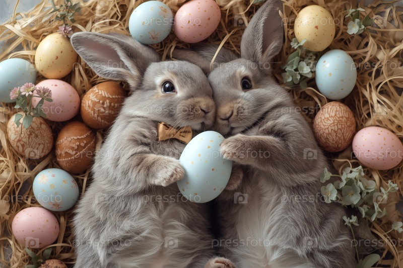 Пасхальные кролики лежат на пасхальных яйцах и смотрят в камеру. праздничная открытка или баннер. счастливая Пасхальная концепция в 2026 году