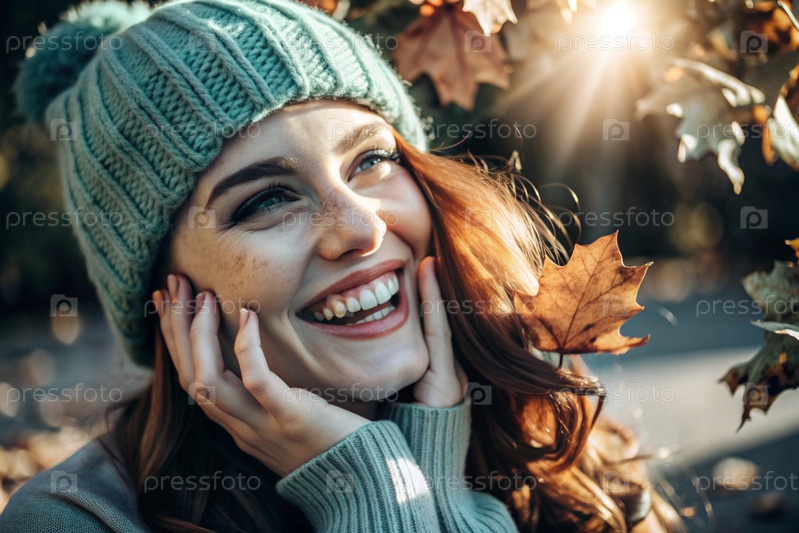 Осенний портрет. Близкий план молодой рыжеволосой женщины с ярко выраженными зелеными глазами в вязанной шляпе и свитере. Девушка смеется под лучами закатывающегося осеннего солнца