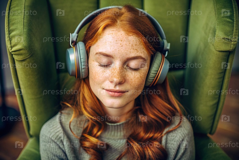 Молодая красивая рыжеволосая женщина с веснушками слушает музыку в больших беспроводных наушниках дома на стуле в гостиной
