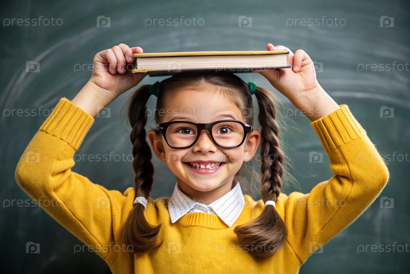 Красивая девушка с очками и книгами на голове. Ребенок впервые идет в школу. Ребёнок в классе со доской на заднем плане. Возвращение к школе