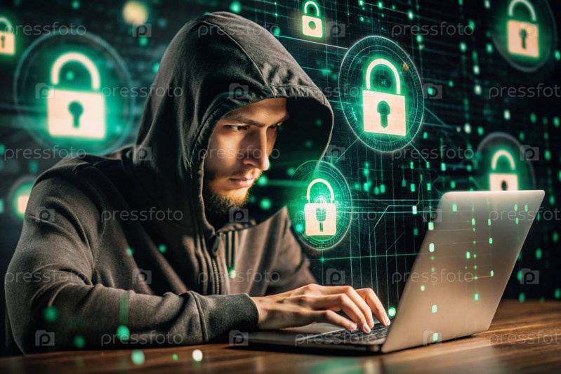 Хакер работает на ноутбуке, цифровые коды на виртуальном фоне. взлом и защита онлайн-данных. цифровые технологии, разработка программного обеспечения