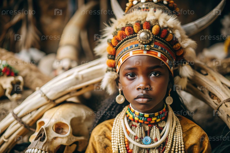 Красивая африканская девушка в традиционном национальном костюме. с костями. портрет символизирует традиции, культуру и красоту африканского народа
