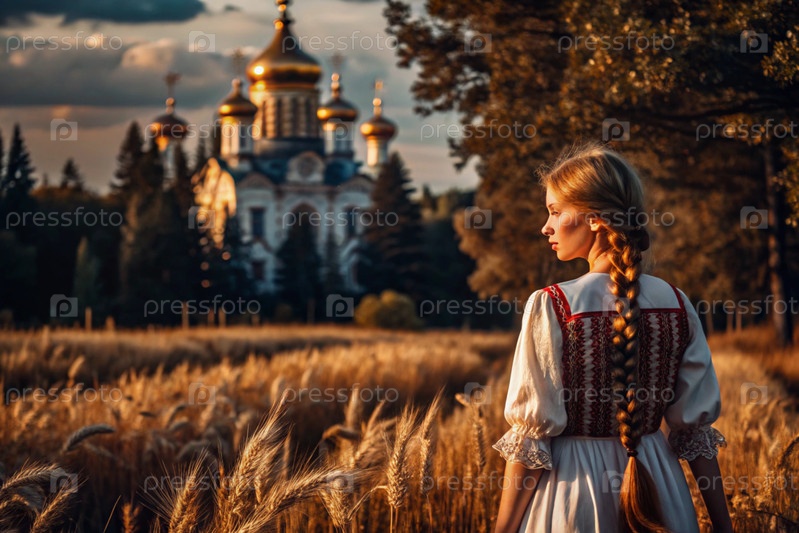 Девушка в традиционном русском льняном наряде и с сковородой на голове на поле спелой золотистой пшеницы на фоне березы и православной церкви