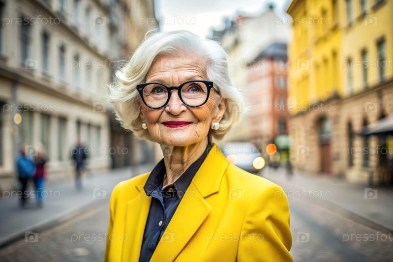 Портрет стильной, модной пожилой женщины, пенсионерки 70 лет на улице города с очками и ярко-желтым костюмом