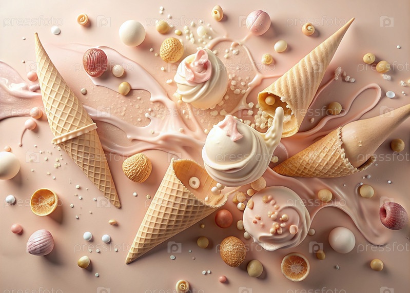 Абстрактная композиция с таяющим мороженым. Плески и брызги мороженого. натюрморт, изображающий перевернутый конус мороженого на светло-розовом фоне