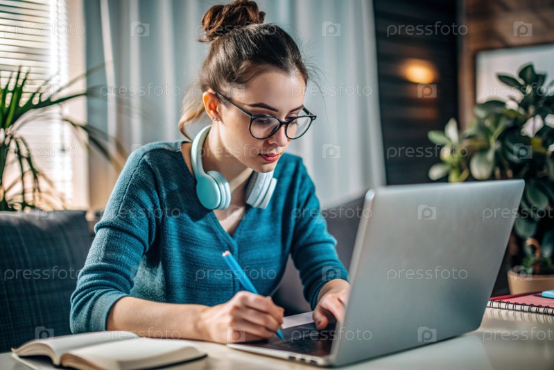 Молодая женщина фрилансер в очках и наушниках работает на ноутбуке или делает покупки в интернет-магазине