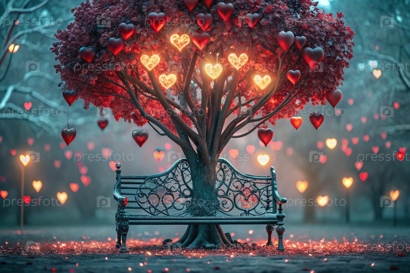 Красивое фантастическое дерево в форме сердца, сияющее среди деревьев парка и скамейка для влюбленных на сказочном фоне боке-стиля