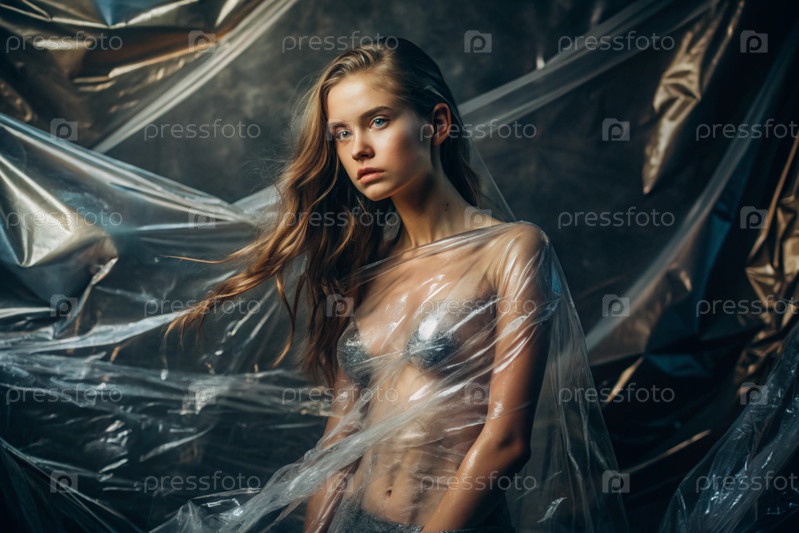 Девочка завернута в целлофан или сумку. Девушка задыхается. Пластиковое загрязнение планеты. Опасность для окружающей среды. Сокращение повторного использования пластика. Переработка. Концепция мусора