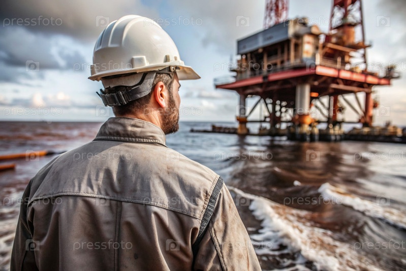 Добыча нефти. Нефтяные скважины и человек в рабочей одежде и строительном шлеме. Нефтяная платформа и промышленное оборудование. Тяжелые условия труда