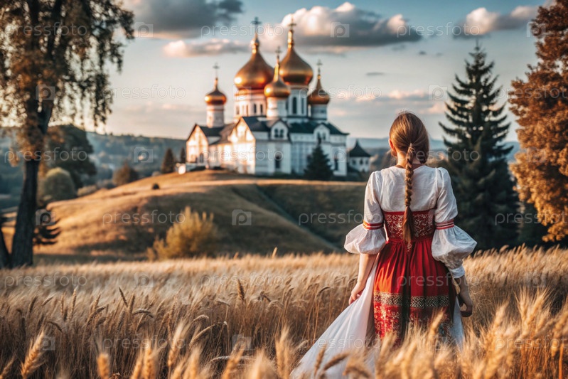 Девушка в традиционном русском льняном наряде и с сковородой на голове на поле спелой золотистой пшеницы на фоне березы и православной церкви