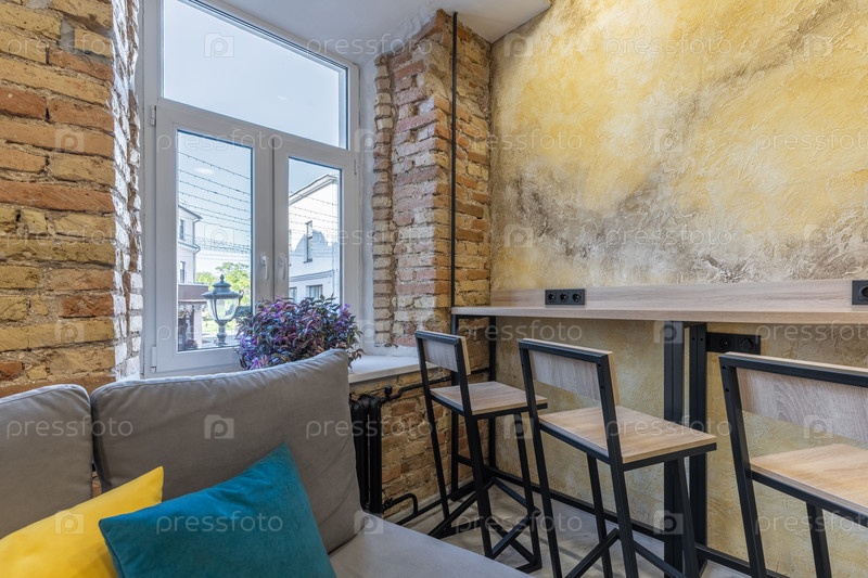 Общая площадь общежития лофта при дневном свете. характеристики деревянного бара на высоком столе против текстурированной желтой стены. большое кирпичное окно предлагает классический вид на улицу, обеспечивая яркое и вдохновляющее рабочее пространство для