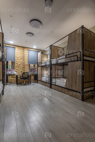 Интерьер современного общежития в стиле лофт ночью. для него характерны ряды деревянных двухъярусных кроватей с металлическими рамами, рабочее пространство возле кирпичной стены и ламинированный пол. яркие потолочные огни освещают чистое минималистическое