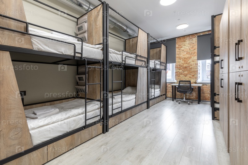 Просторный хостел в стиле промышленного лофта. характеризуется рядом деревянных двухэтажных кроватей с черными металлическими рамами и большими шкафчиками для хранения. включает рабочее пространство со столом на кирпичной стене, ламинированные полы и мини