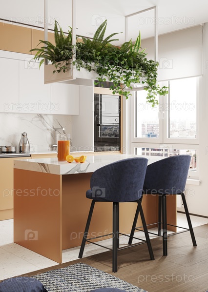 Современный кухонный интерьер с оранжевым островом с голубыми стульями, висячий плантатор с зеленью и свежим апельсиновым соком на мраморной стойке