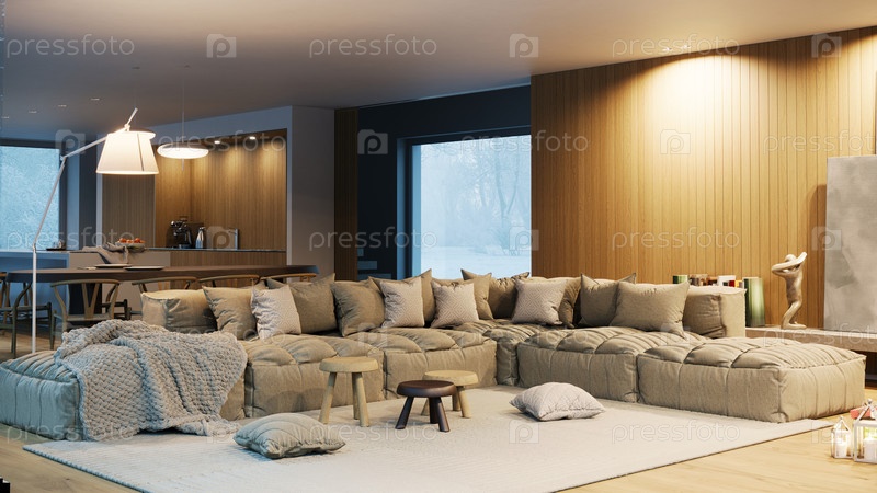 Современный интерьер гостиной с большим бежевым диваном. снежный зимний пейзаж в окне