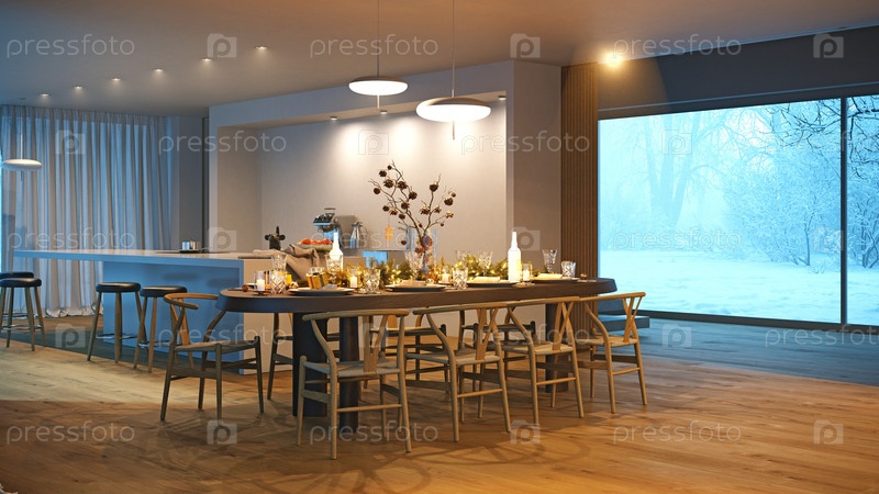 Рождественский обеденный стол в современном интерьере с видом на снежное зимнее окно