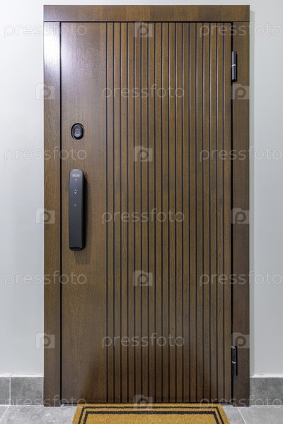 Полный вертикальный вид современной коричневой деревянной входной двери с гладким черным умным замком и вертикальной реброобразной текстурой.Дверь установлена на светло-серых стенах с желтым ковром у входа