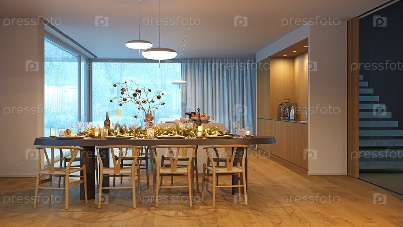 Для рождественского ужина установлен современный обеденный стол.Люксовый интерьер с снежным зимним видом