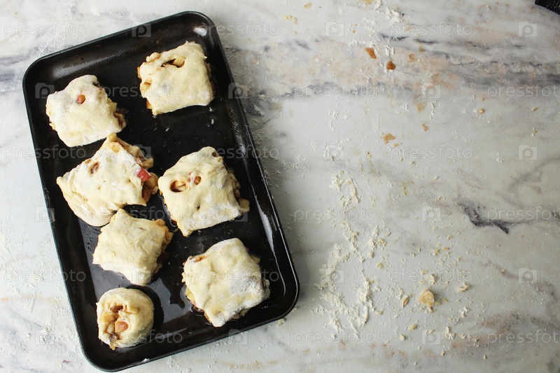 Сырые булочки на черном пекарском листе с верхним видом для экста-кописпейса