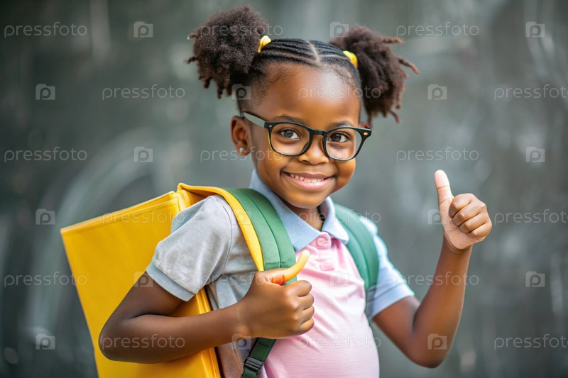 Милая чернокожая афроамериканка с очками показывает класс рукой. Ребенок впервые идет в школу. Ребёнок со школьной сумкой и книгой. Ребёнок в классе с доской. Возвращение к школе