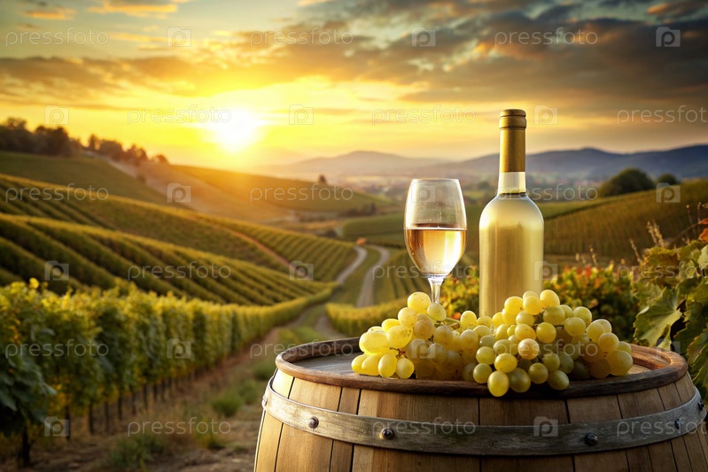 Бутылка белого вина и куча спелых виноград на деревянной дубовой бочке на фоне виноградника