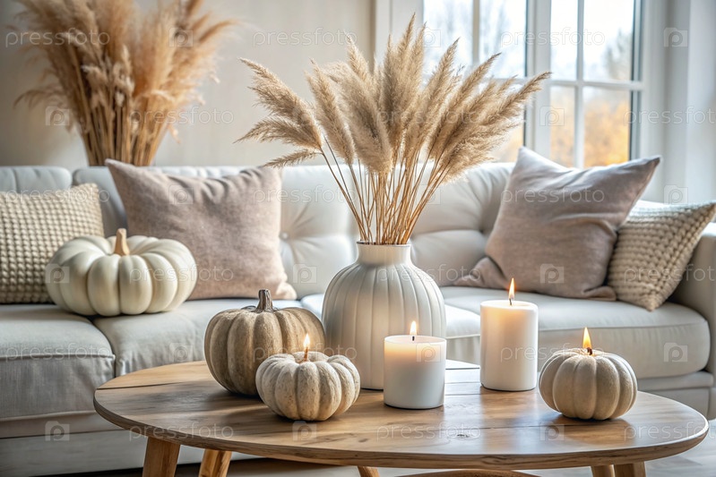 Современная белая керамическая ваза с сухой травой, свечами на деревянном столе и тыквами Скандинавский интерьер Концепция осеннего декора и комфорта в доме