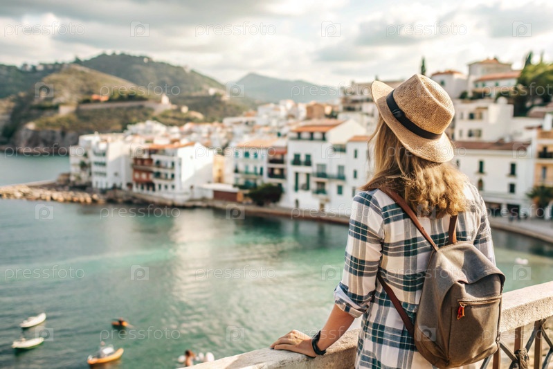 Девушка-путешественница с рюкзаком на фоне южного побережья моря. она путешествует и наслаждается жизнью и окружающей средой. туризм
