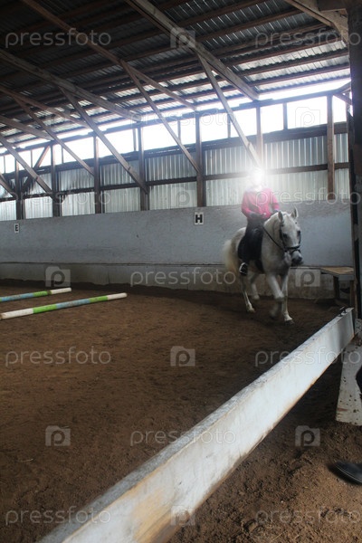 Лошадь галопирует по арене.Белый конь