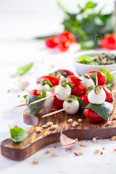 Капресовые сковороды с вишневыми помидорами, моцареллой и зеленым базиликом