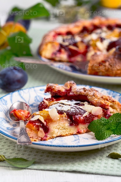 Кусок открытого торта с сливами