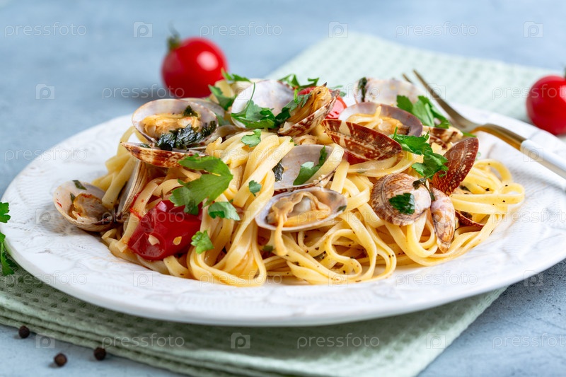 Лингвиновая паста с помидорами из вонголы и вишней