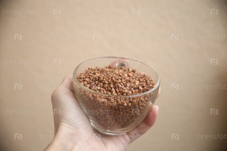 Рука женщины держит миску с сырыми зерновыми из гречихи