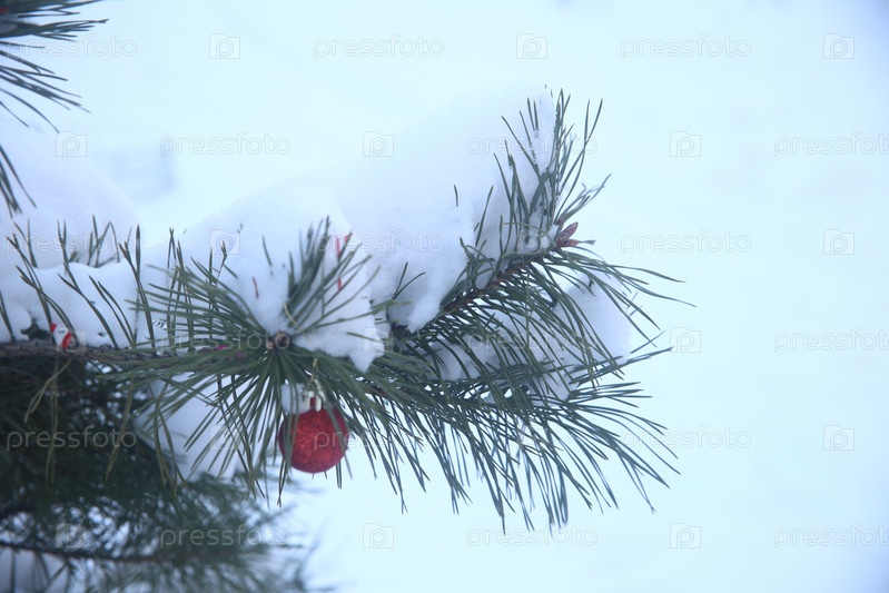 Зимний ландшафт со снежными деревьями и ветвями с игрушками для рождественской елки