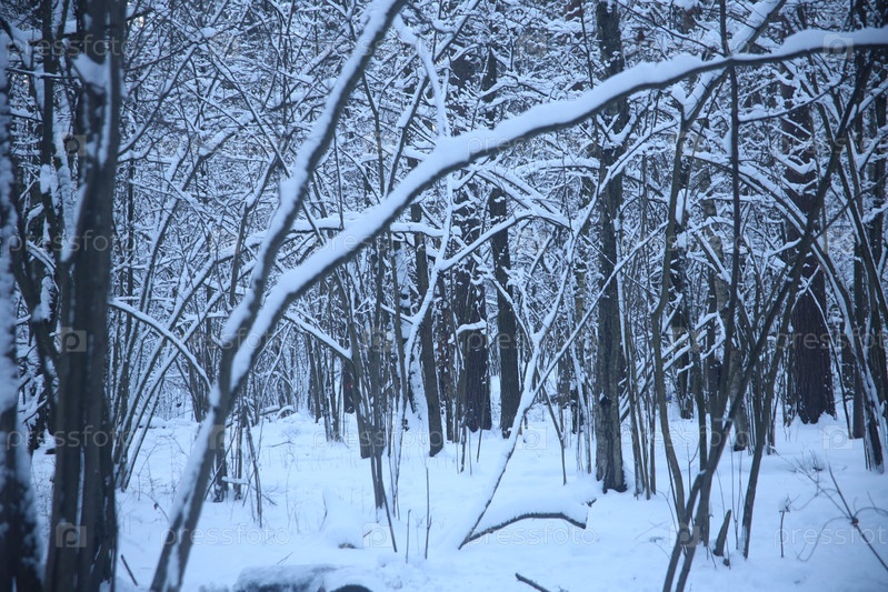 Зимний пейзаж с заснеженными деревьями и ветвями в лесу