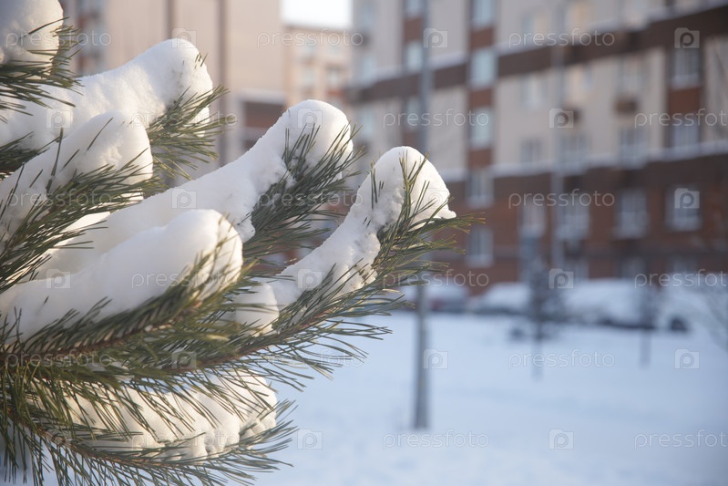 Зимний пейзаж с заснеженными деревьями и ветвями на фоне домов