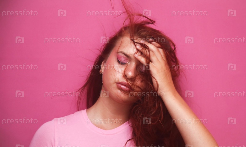 Красивая девушка позирует в студии на розовом фоне