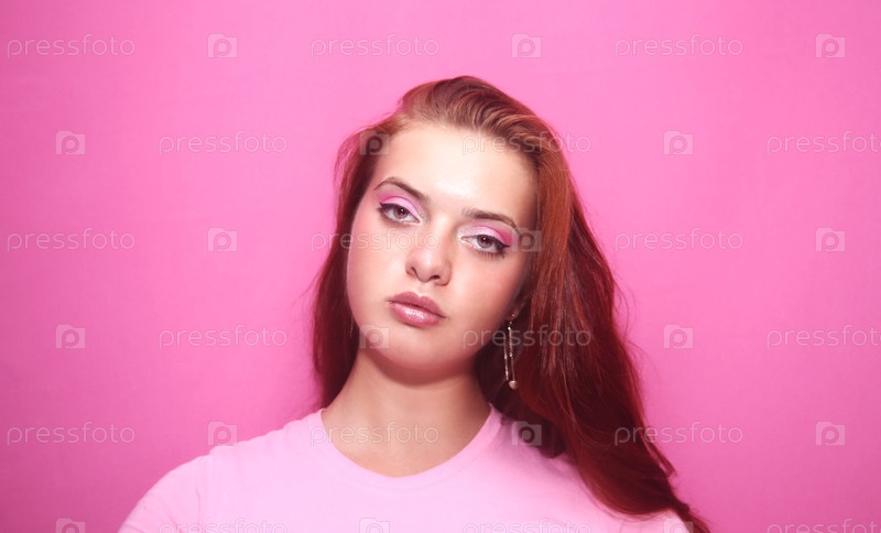 Красивая девушка позирует в студии на розовом фоне