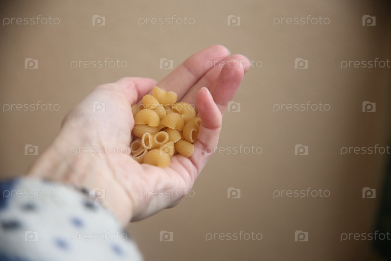 Сырые рога макаронных изделий в руке женщины