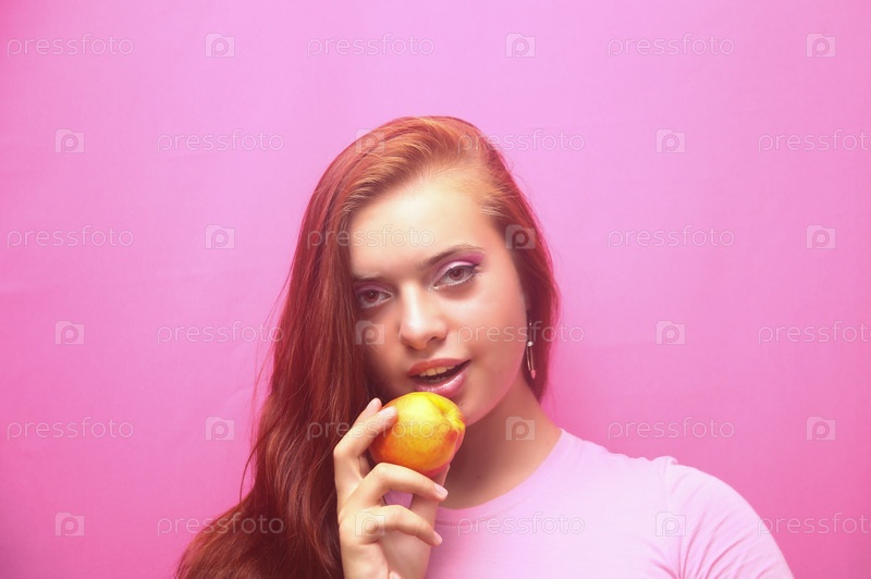 Красивая девушка позирует в студии с персиком