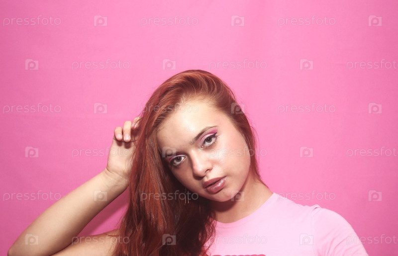 Красивая девушка позирует в студии на розовом фоне
