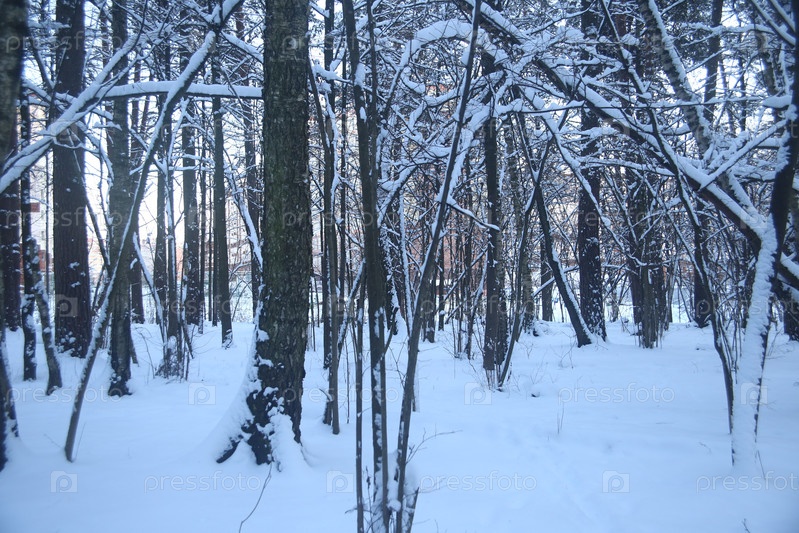 Зимний пейзаж с заснеженными деревьями и ветвями в лесу