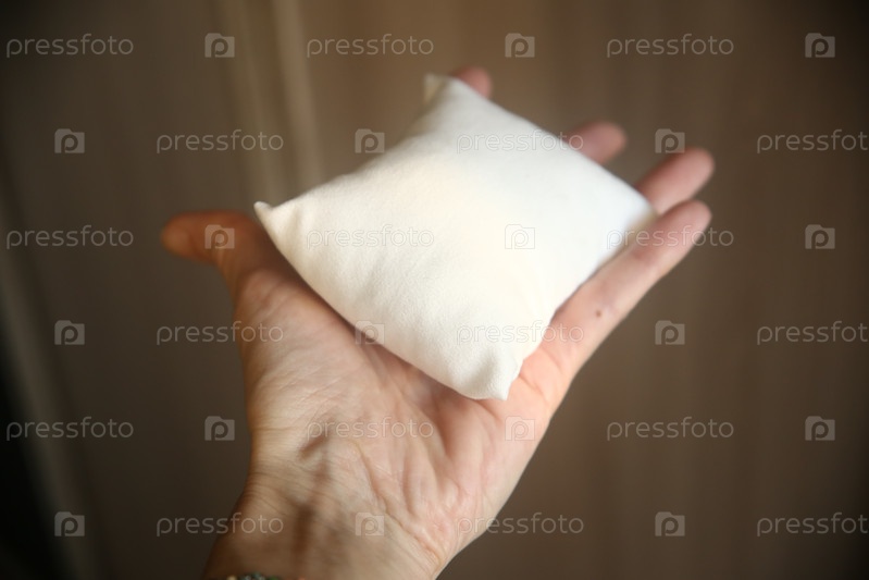 Рука женщины держит маленькую белую подушку