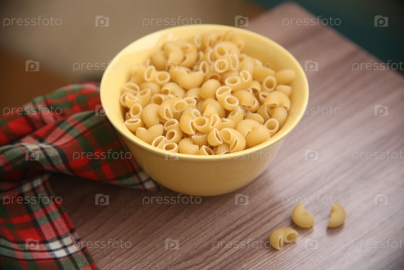 Сырые рога макарон в тарелке на столе