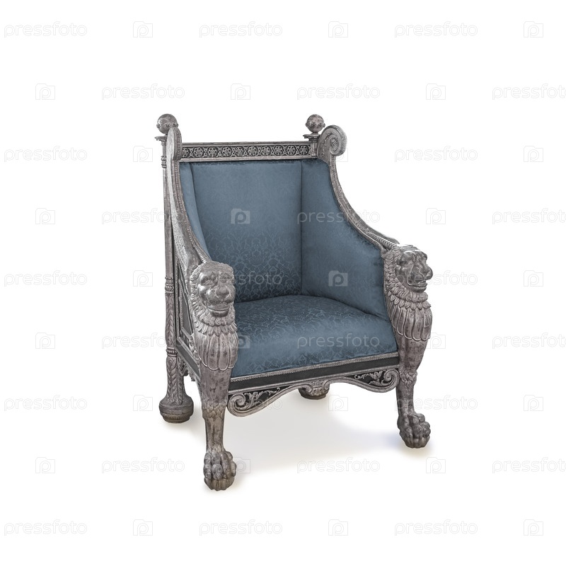 Древний золотой кресло украшено крылатыми львами, изолированными на белом фоне